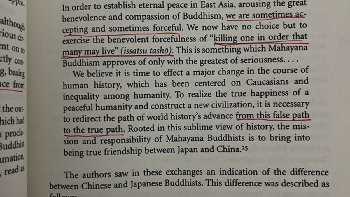 "...In order to establish eternal peace in East Asia, arousing the great benevolence and compassion of Buddhism, we are sometimes accepting and sometimes forceful. We now have no choice but to exercise the benevolent forcefullness of "killing one in order that many may live...