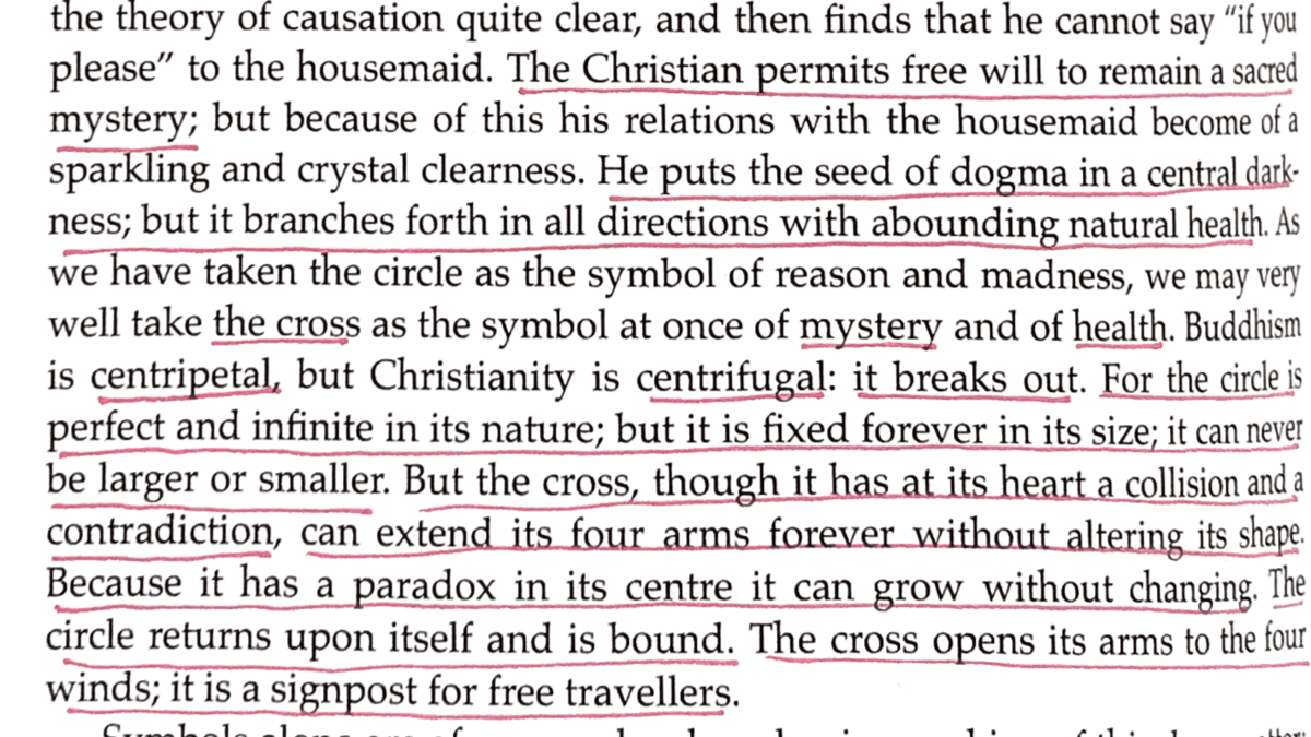 "Buddhism is centripetal, but Christianity is centrifugal: it breaks out. For the circle is perfect and infinite in its nature; but it is fixed forever in its size; it can never be larger or smaller. But the cross, though it has at its heart a collision and a contradiction, can extend its four arms forever without altering its shape. Because it has a paradox in its centre it can grow without changing. The circle returns upon itself and is bound. The cross opens its arms to the four winds; it is a signpost for free travellers."